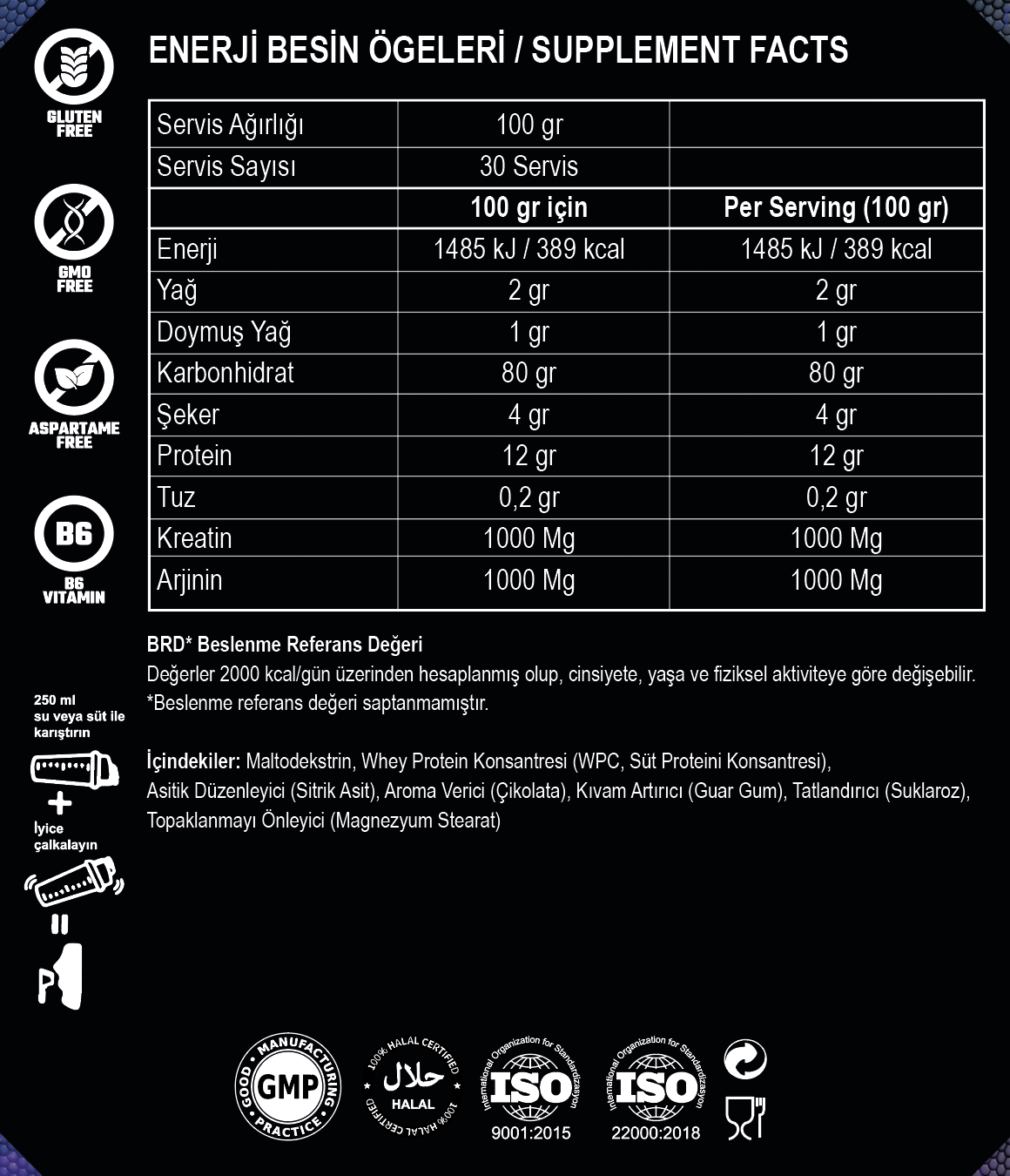 Bulk dönemlerinde artan kalori ve besin ihtiyacını karşılamak üzere özel olarak geliştirilen gainer formülümüz; 80 gram karbonhidrat, 12 gram protein, 1 gram arjinin ve 1 gram kreatin desteğiyle kas kütlesi artışını ve antrenman performansını aynı anda hedefler.